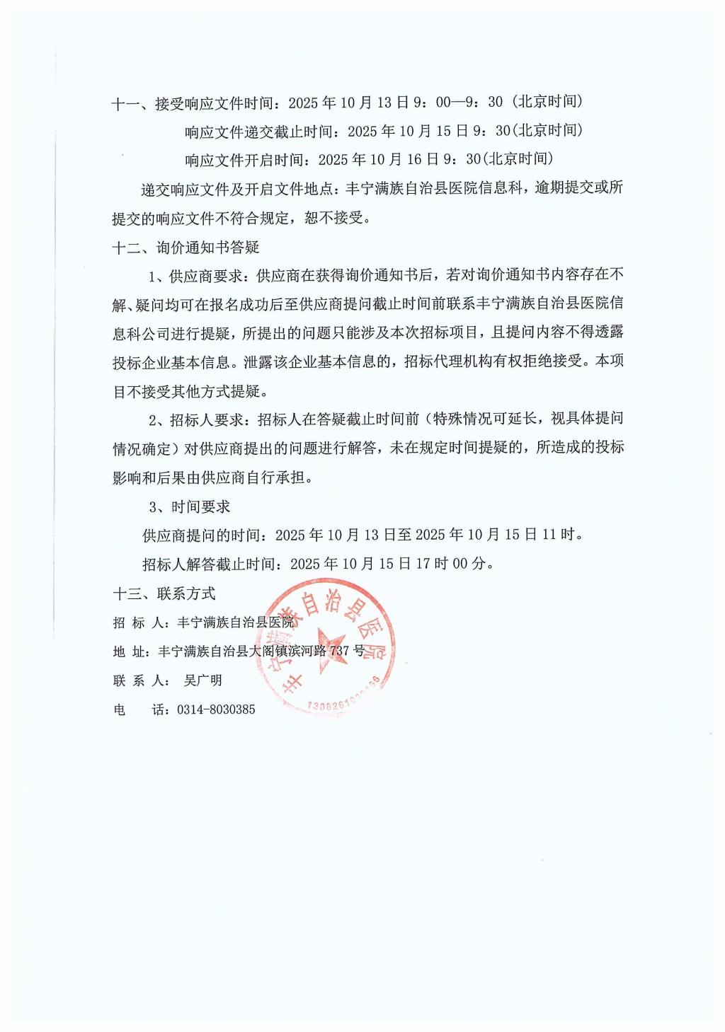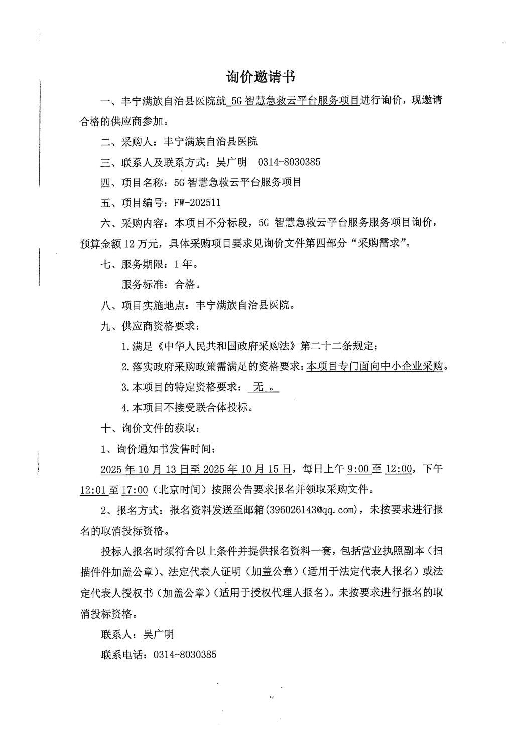 丰宁满族自治县医院5G智慧急救云平台服务项目询价邀请书