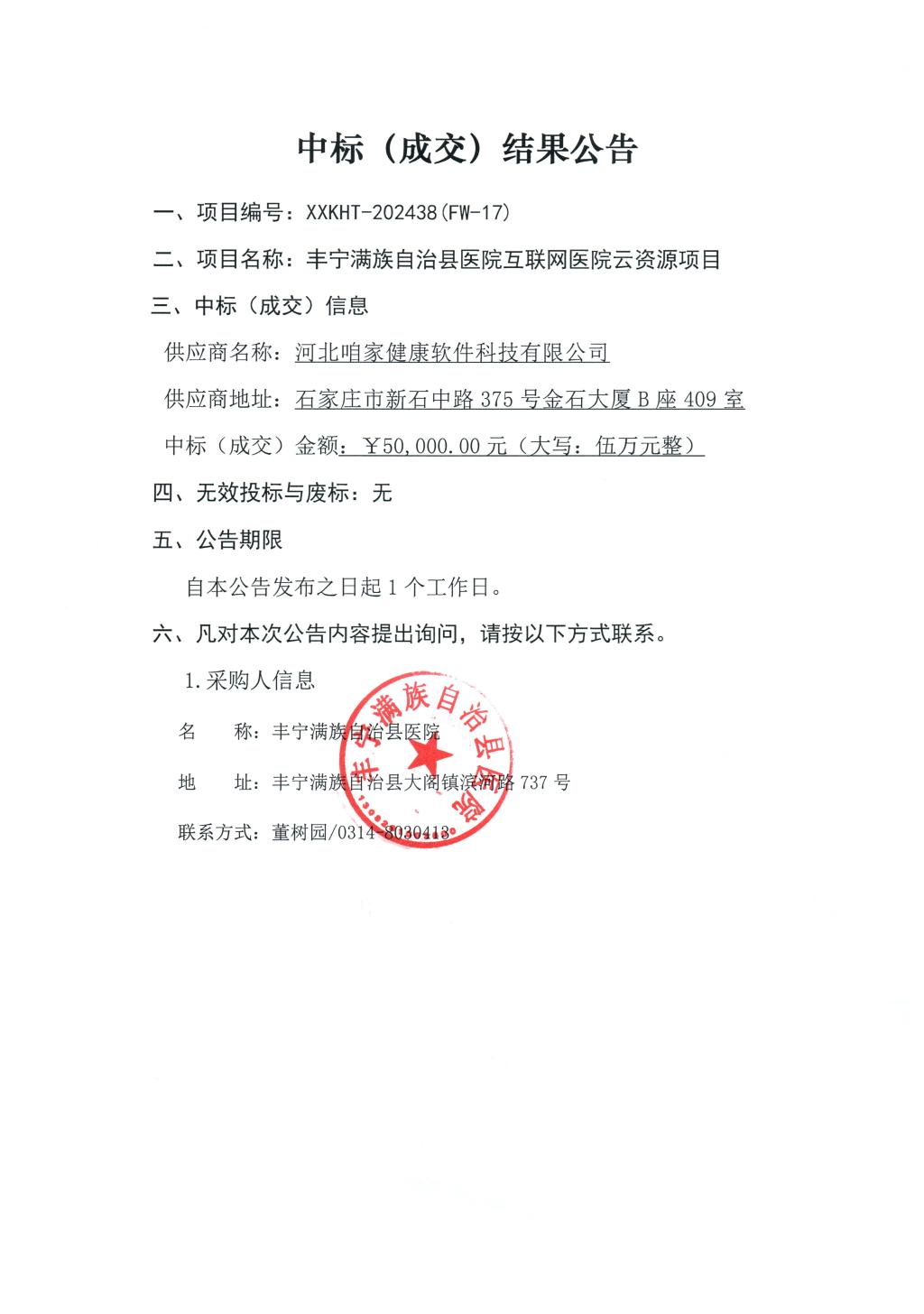 丰宁满族自治县医院互联网医院云资源项目中标(成交)结果公告
