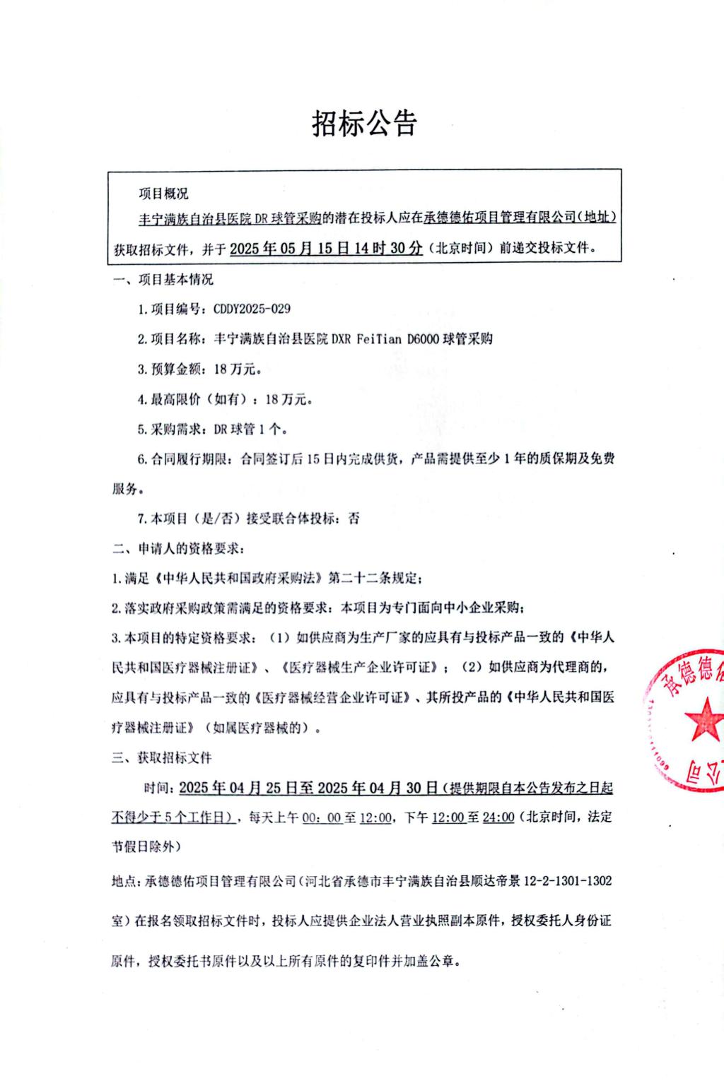 丰宁满族自治县医院DXR FeiTian D6000球管采购